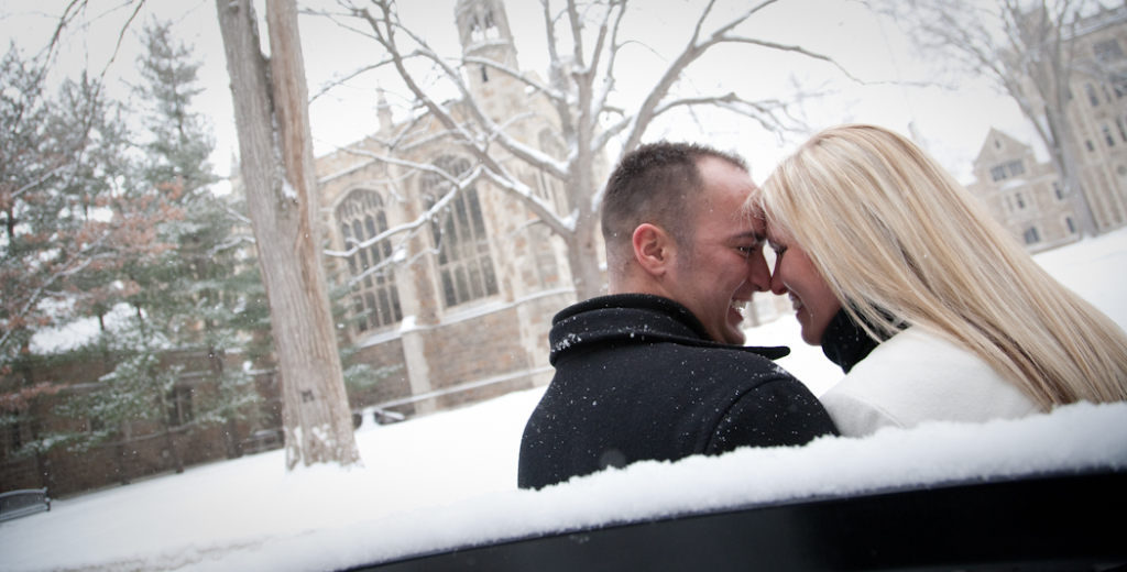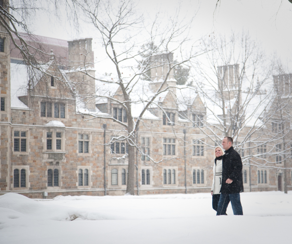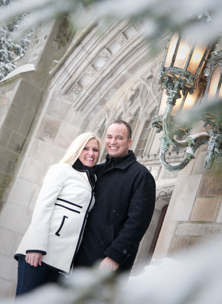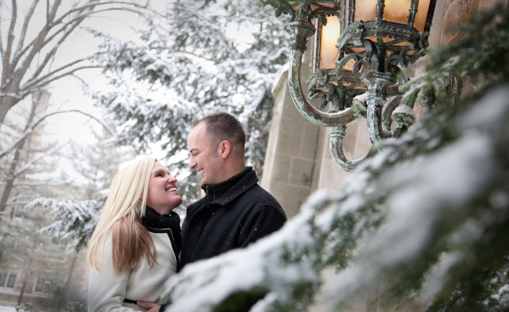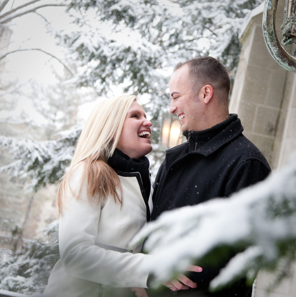 Not everybody is willing to brave a cold and snowy winter day for engagement photos Ann Arbor MI, but Katie & John were up for the challenge! Their warm and genuine smiles kept the cold at bay and we got some gorgeous shots! Even a resident squirrel had to sneak a peek at this beautiful couple. One of our all time favorite photos is the one of Katie and John in a full blown laugh with Katie’s hair blowing in the wind.