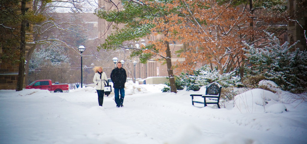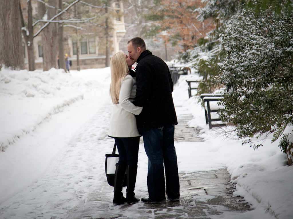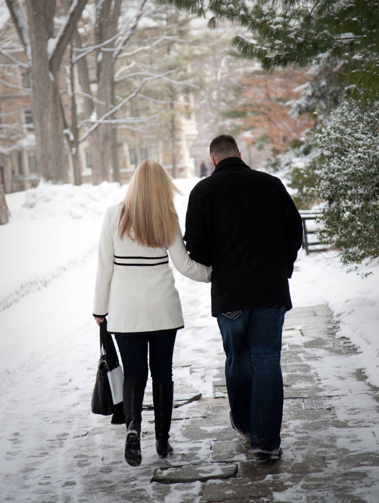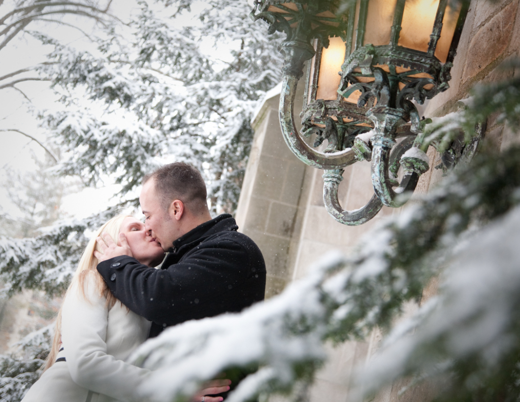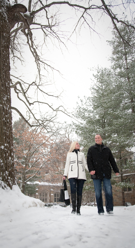 Not everybody is willing to brave a cold and snowy winter day for engagement photos Ann Arbor MI, but Katie & John were up for the challenge! Their warm and genuine smiles kept the cold at bay and we got some gorgeous shots! Even a resident squirrel had to sneak a peek at this beautiful couple. One of our all time favorite photos is the one of Katie and John in a full blown laugh with Katie’s hair blowing in the wind.