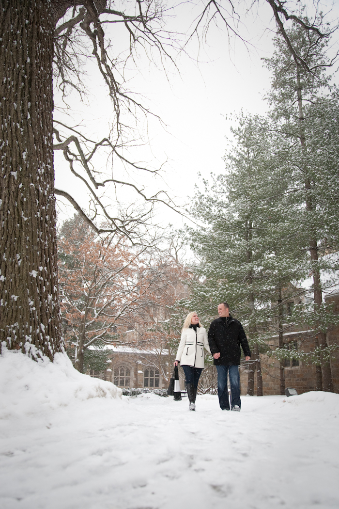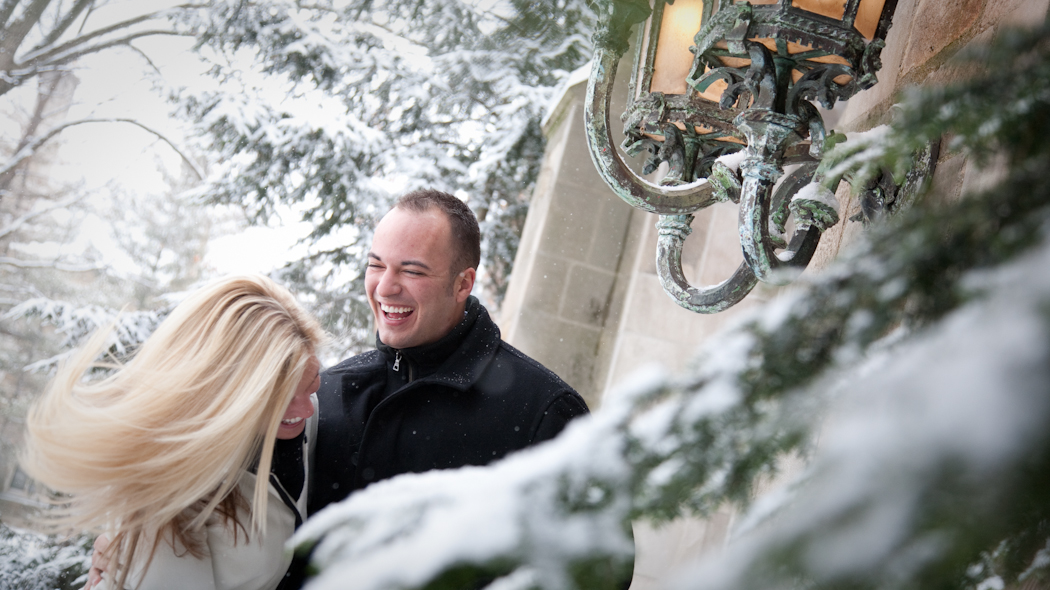 Not everybody is willing to brave a cold and snowy winter day for engagement photos Ann Arbor MI, but Katie & John were up for the challenge! Â Their warm and genuine smiles kept the cold at bay and we got some gorgeous shots! Â Even a resident squirrel had to sneak a peek at this beautiful couple. Â One of our all time favorite photos is the one of Katie and John in a full blown laugh with Katie’s hair blowing in the wind.