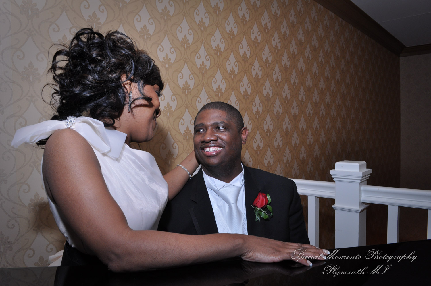Urenia & Phillip were married at one of the most stunning churches in Detroit, Fort Street Presbyterian Church.   So much great emotion going on that day!  They had such a great time being in the moment, they really did have a wonderful time all day!  Their wedding party was a blast!  And what an amazing dress, and veil Urenia had!  She even had a beautiful short dress for the end of the evening.   The reception was held at the Dearborn Inn and as always they did an amazing job!  Congratulations Urenia & Phillip.